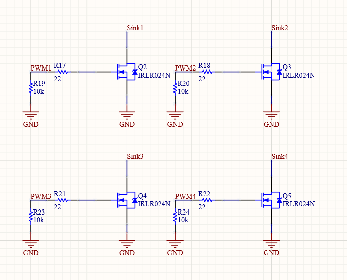 FET’s have basic 22 ohm serial resistor at gate and 10k ohm pulldown at side of processor.