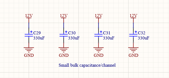 Some bulk capacitance are also added/channel for just in case if needed. They have not been assembled at PCB.